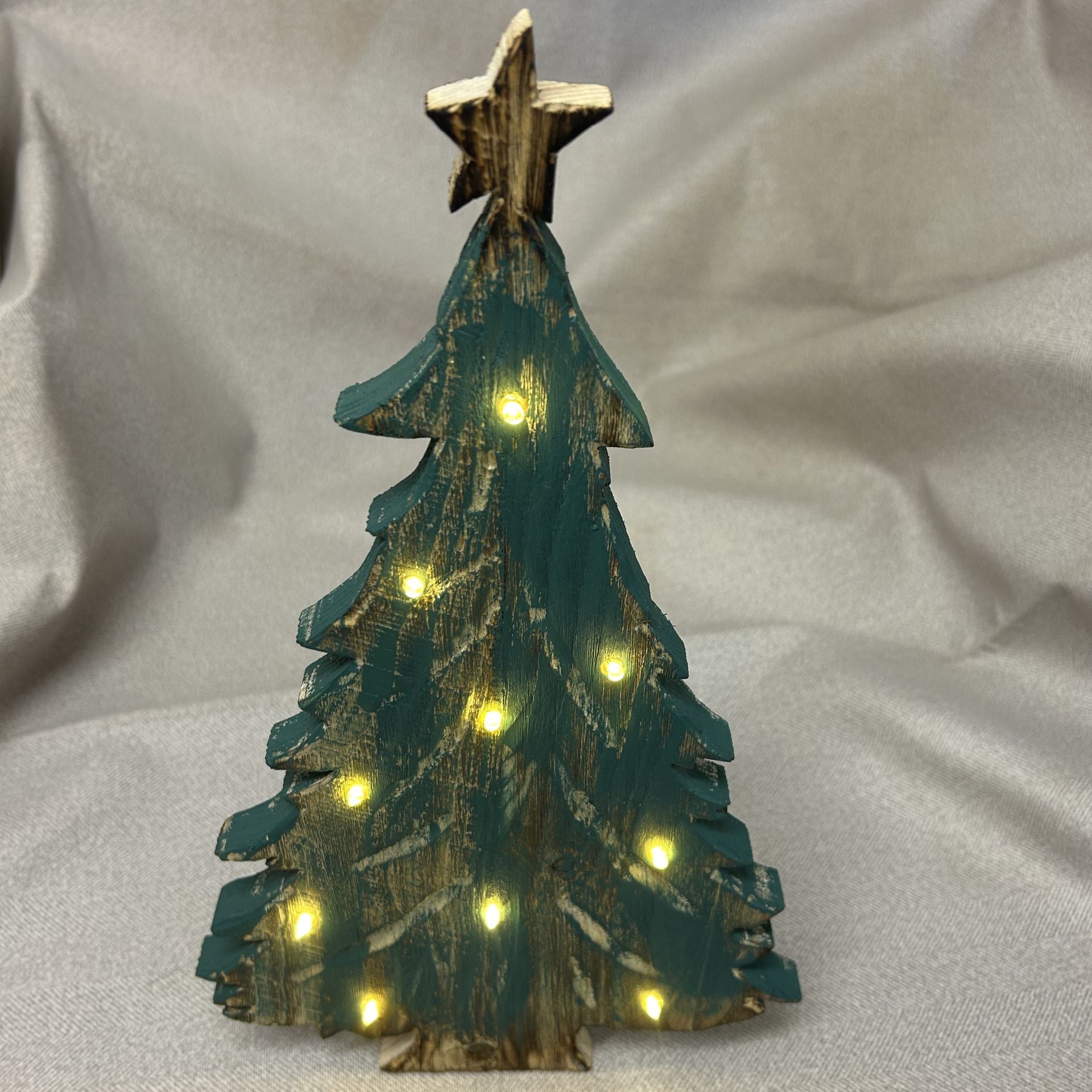 Höhe 370mm x Breite 210mm. Ein beleuchteter Tannenbaum aus Recyclingholz. Die Lichterkette ist inbegriffen, die Batterien aber nicht.